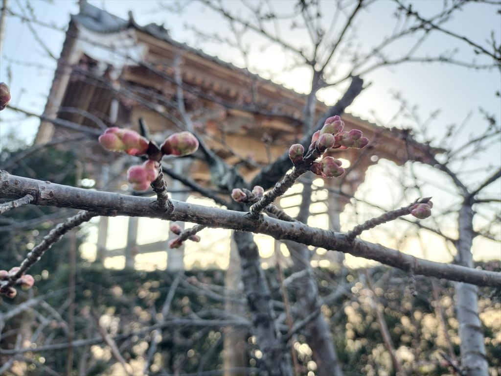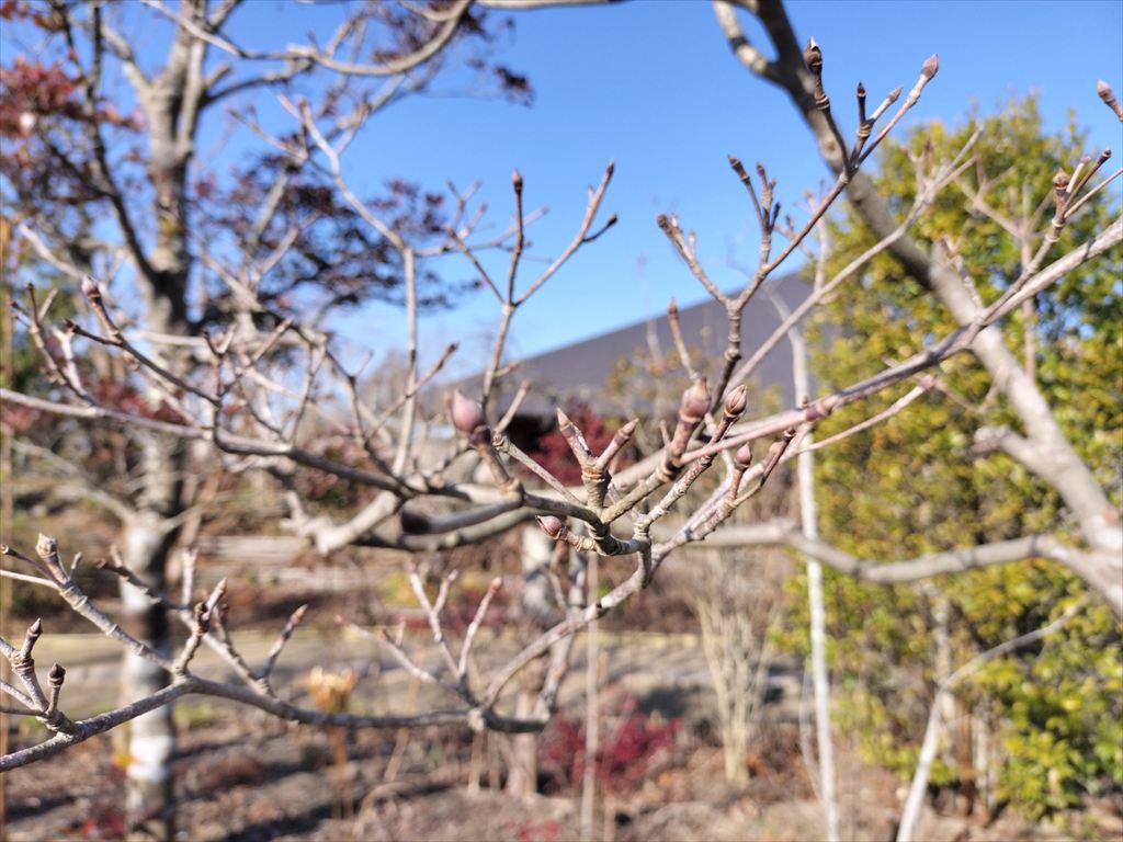 河津桜の蕾が膨らみ始め、